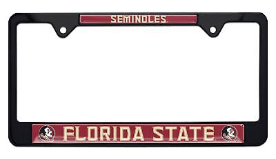 Officially licensed - Florida State University “Seminoles” black license plate frame by Elektroplate. All-metal (NOT plastic) frame with a black finish, and full color UV-protected domed inserts that are Made in the USA.