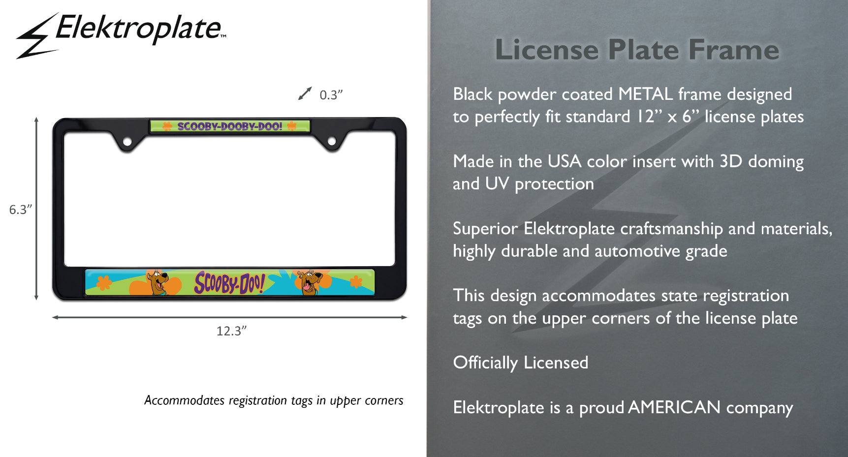 Elevate your vehicle's style with this Officially Licensed Scooby-Dooby-Doo black powder coated metal license plate frame (12.3" X 6.3") by Elektroplate. This high-quality all-metal frame is built to endure the elements, ensuring it remains looking brand new for years without chipping or fading. The frame features Made in the USA graphic inserts with 3D doming, vivid colors, and UV protection.