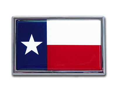 State of Texas chrome auto emblem - 4.25" x 2.75" x .125" - Base and frame crafted of chrome-plated metal (NOT plastic). Decal within chrome frame is laminated with an 1/8" thick PVC made to withstand any outdoor conditions (guaranteed not to fade or bleed unlike cheap imitations). Attaches via a paint-safe 3M adhesive foam tape.