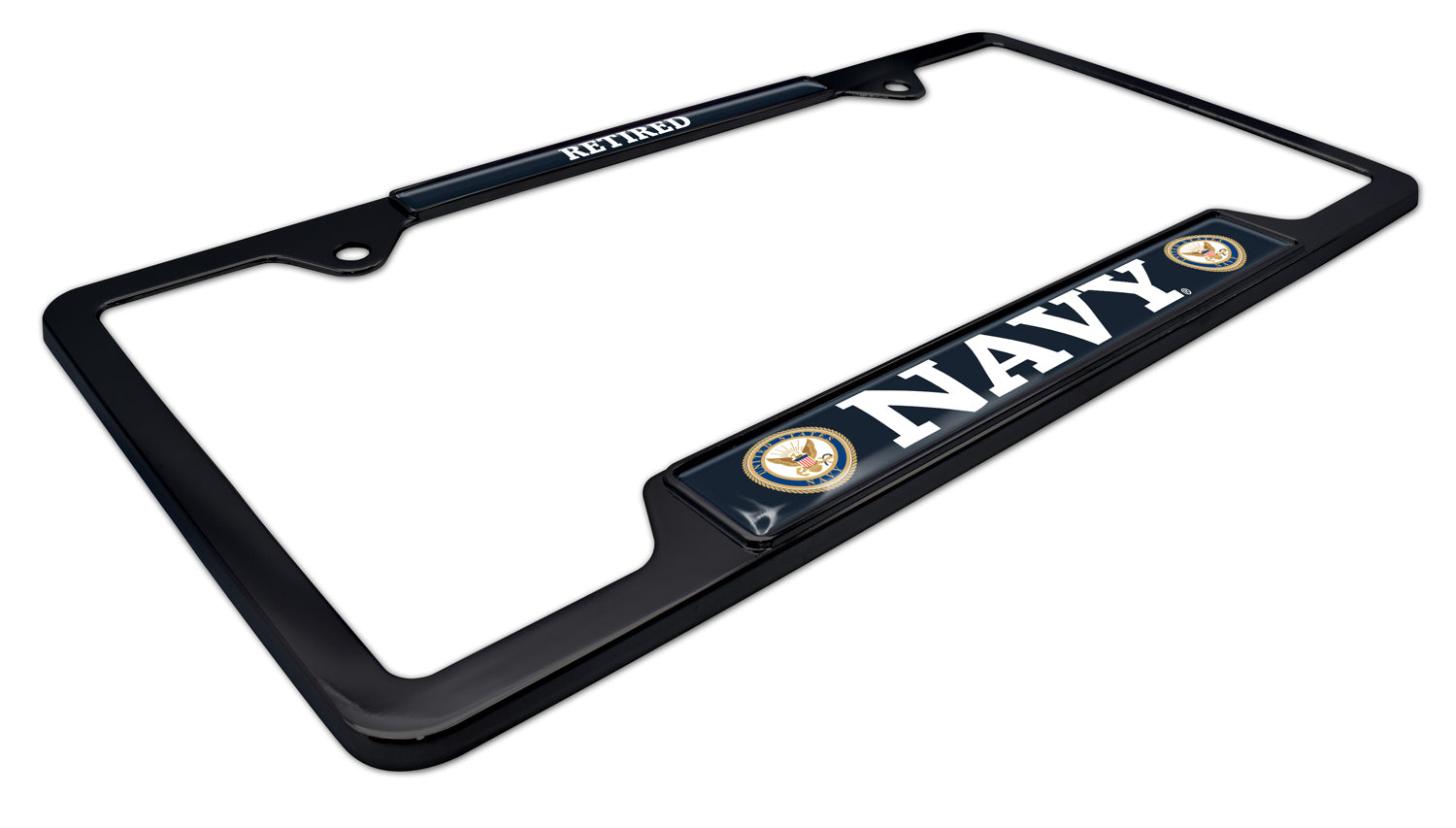 Officially licensed – U.S. Navy black metal license plate frame by Elektroplate. All-metal (NOT plastic) frame with a black finish, and full color UV-protected domed inserts.
